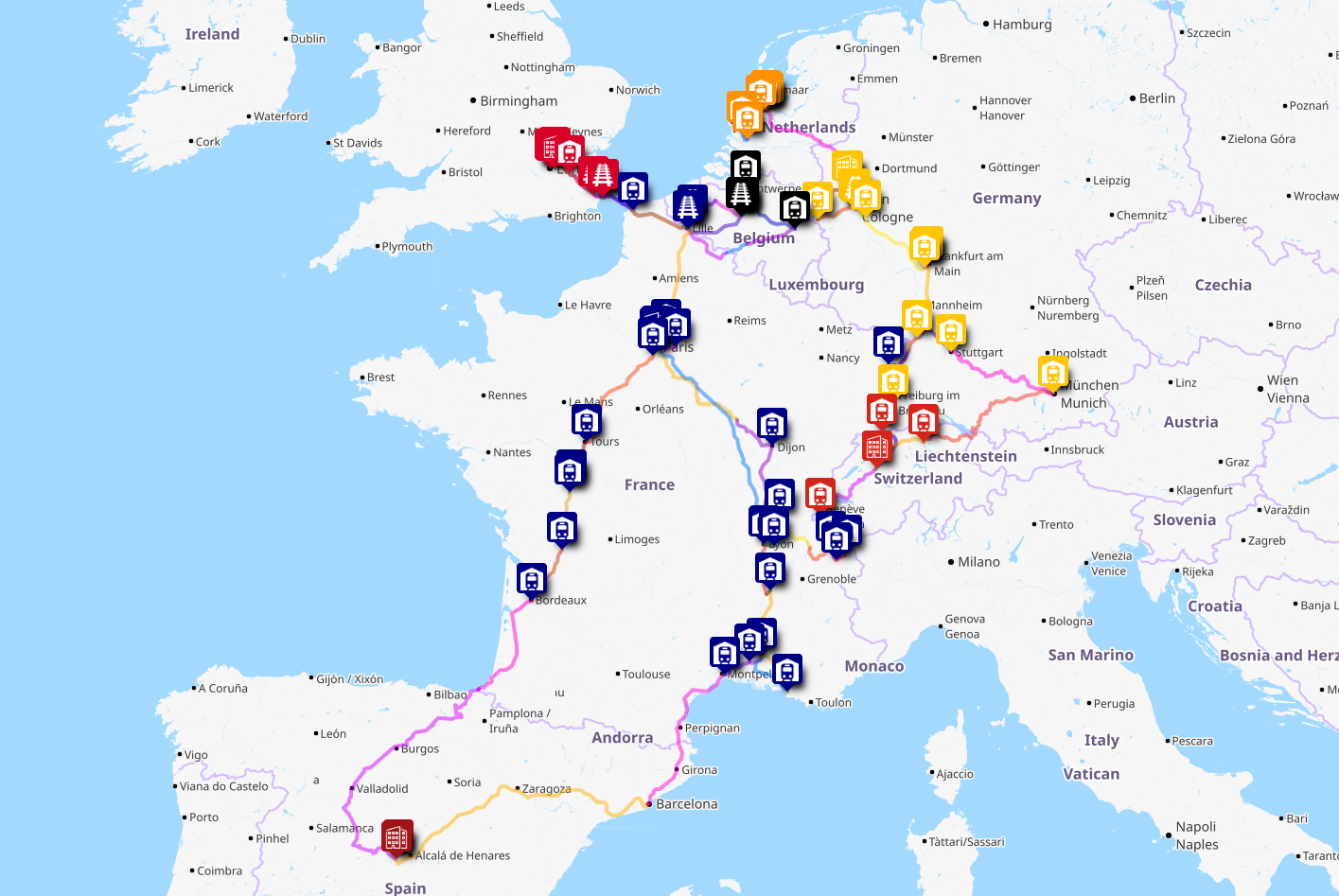 Trains serving other destinations in the UK beyond London will not be examined – the choice to not connect HS2 to HS1, and the difficulties with the UK having a non-standard loading gauge mean UK destinations other than those along HS1 will not be covered. Night trains to the UK will likewise not be examined – it is already too complex to run night trains across much of Europe (hell, I have a whole website about it!) without adding the Channel Tunnel complexity on top! Train + ferry connections to the UK will likewise not be examined – those probably merit a project of their own, but I cannot add those here – for financial and time reasons (the tour for this project is already 3 weeks long!)