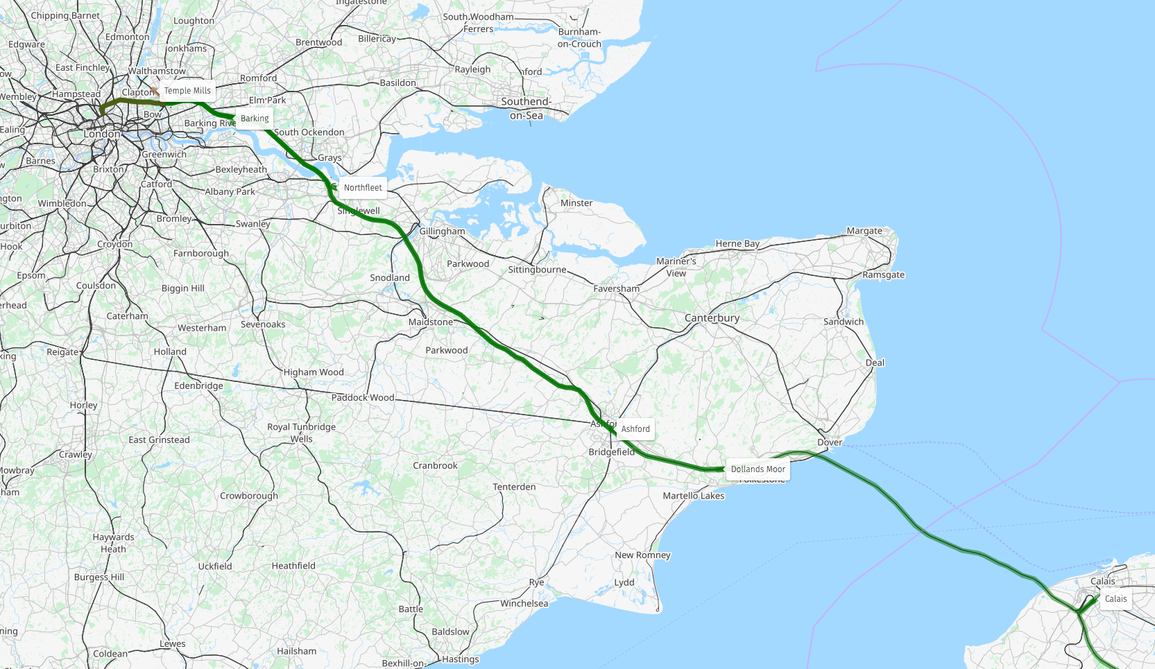 Nothing is as good as Temple Mills, but there are a few options. Something at or close to the Barking container terminal (20km from St Pancras) might work, although track access off HS1 and the total space available are complicated. There are sidings in an old quarry at Northfleet, just beyond Ebbsfleet station on HS1. A depot here would likely accommodate max 200m trains, but it is brownfield land and is just 37km from St Pancras. At Ashford there is the maintenance facility for Hitachi’s class 395 trains, but access to the depot is third rail electrified only at the moment, and the site is very constrained. Ex railway land south east of Ashford station also merits a further look, although Ashford is 91km from London. Dollands Moor the under-used freight terminal at the UK end of the Channel Tunnel would likely have enough space, but as it is 107km from London its location is not ideal. While the Eurotunnel terminal in the UK is rather constrained, the Calais terminal has plenty of space and maintenance facilities for locomotives – but that is 166km from London.