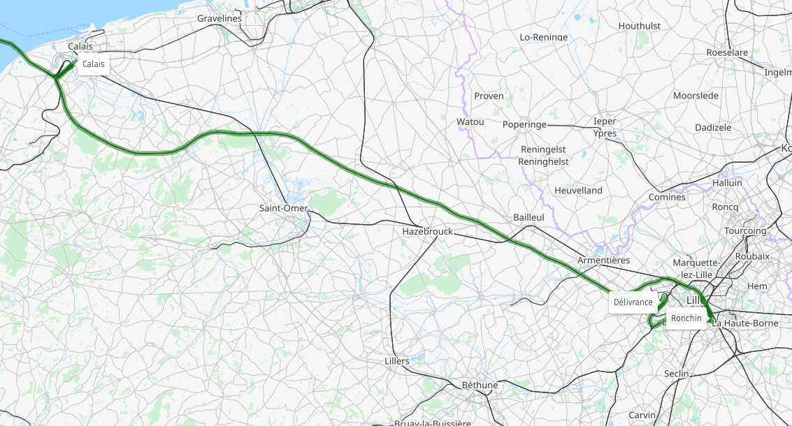 Theoretically empty stock could be moved from Calais to Lille and services start there. But that is still 105km. Déliverance in Lille, a freight yard to the west of the city, has plenty of space and is 16km from Lille Europe station on existing infrastructure. Ronchin – a site used by SNCF track maintenance trains currently – is only 3km from Lille Europe, but a small connecting curve is missing, preventing easy access from there to Lille Europe.