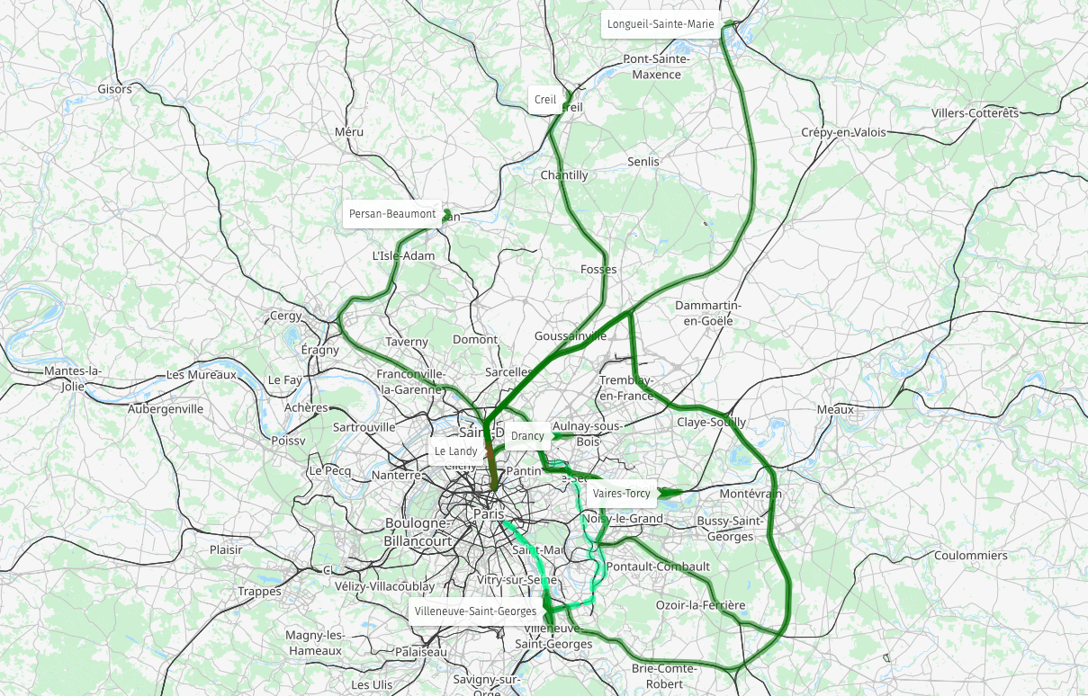 And then to greater Paris. This is really complicated. The most obvious site to develop would be Drancy (12km from Paris Nord), but the track layout between La Plaine and Paris Nord is far from ideal, and getting paths could be complicated. Vaires-Torcy has plenty of space, but getting to Paris Nord from there is even more complicated – it is either a horrible 112km around the outer edge of Paris, or 34km but needing reversing at Pierrefitte. Drancy could be an alternative for the reversing manoeuvre. Villeneuve-Saint-Georges likewise has plenty of space, but is 104km from Paris Nord. These three sites could be of particular interest to Trenitalia as Paris Gare de Lyon can also be reached from these (41km from Drancy, 37km from Vaires-Torcy and 13km from Villeneuve-Saint-Georges).